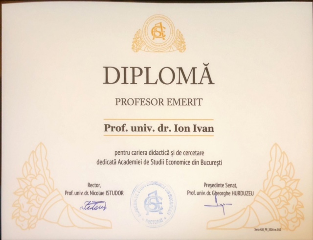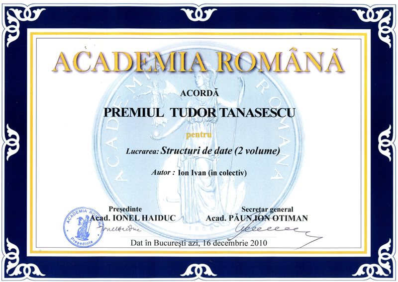DIPLOMELE mele DIPLOMA NICOLAE GEORGESCU ROEGEN, 2000, Senatul Academiei de Studii Economice DIPLOMA NICOLAE GEORGESCU ROEGEN, 2001, Senatul Academiei de Studii Economice DIPLOMA NICOLAE GEORGESCU ROEGEN, 2002, Senatul Academiei de Studii Economice DIPLOMA NICOLAE GEORGESCU ROEGEN, 2003, Senatul Academiei de Studii Economice DIPLOMA OPERA OMNIA, 2003, Senatul Academiei de Studii Economice DIPLOMA NICOLAE GEORGESCU ROEGEN, 2004, Senatul Academiei de Studii Economice DIPLOMA Diploma de Onoare , 2004, Societatea Romana de Statistica DIPLOMA DE EXCELENTA VIRGIL MADGEARU, 8 Aprilie 2005, Senatul Academiei de Studii Economice Premiul OPERA OMNIA Acordat in baza competitiei organizate de Consiliul National al Cercetarii Stiintifice din Invatamantul Superior, 6 Mai 2005DIPLOMA NICOLAE GEORGESCU ROEGEN, 2005, Senatul Academiei de Studii Economice Evaluare privind indeplinirea cu calificativul foarte bine a conditiilor de ocupare a postului de profesor universitar realizata in anul 2006 DIPLOMA DIPLOMA DE EXCELENTA, 2006, Asociatia Profesionala INFOREC DIPLOMA DIPLOMA DE PARTICIPARE LA CONFERINTA DIN 26-27 OCTOMBRIE DE LA CLUJ-NAPOCA, 2006, Universitatea Babes-Bolyai din Cluj-Napoca MENTIUNE oferita de Asociatia Facultatilor de Economie din Romania 2008 pentru lucrarea STABILITATEA COEFICIENTILOR MODELULUI GLOBAL DE CALITATE SOFTWARE Editura ASE Bucuresti 2006 Premiul Tudor TĂNĂSESCU al Academiei Române pe anul 2008, mi-a fost acordat in sedinta festiva din 16 decembrie 2010, pentru lucrarea Structuri de date, coordonata de Ion IVAN, Marius POPA, Paul POCATILU Premiul Tudor TĂNĂSESCU al Academiei Române pe anul 2008, mi-a fost acordat in sedinta festiva din 15 decembrie 2017, pentru lucrarea PROGRAMAREA APLICATIILOR ANDROID, realizata de un colectiv format din Paul POCATILU, Ion IVAN, Adrian VISOIU, Felician ALECU, Alin ZAMFIROIU, Bogdan IANCU DIPLOMA si MEDALIA de AUR VIRGIL MADGEARU, Hotararea Seneatului ASE din28-06-2017, festivitatea de acordare din Aula Magna a fost in 17 octombrie 2017 DIPLOMA de Profesor Emerit, Hotararea Seneatului ASE din 25-03-2026, festivitatea de acordare din Aula Magna a fost in 1 aprilie 2026