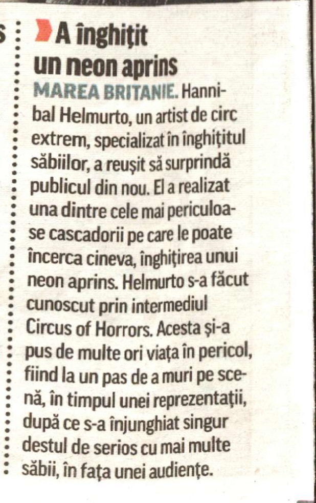 Aceasta nu este o mostra decenta de oarece documentare, ci este un monument de ignoranta din partea celor ce pozeaza in doctori in orice. Adica sa scri ca unul care a inghitit un tub de neon a facut o cascadorie este cel putin demonstratia clara a faptului ca insul care a scris nu are proprietatea termenilor...