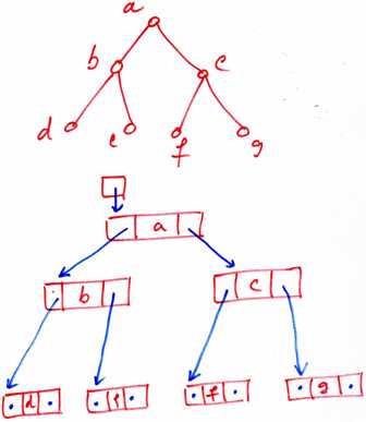 | Arborele binar se reprezinta folosind: - un pointer cu care se refera radacina a - zone de memorie avand cate 3 campuri pentru informatia utila, pentru a referi cei doi descendenti. Pointerii de la nodurile frunza sunt initializati cu NULL. |