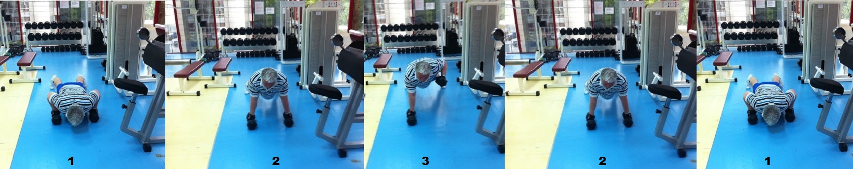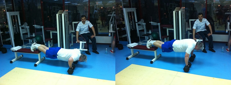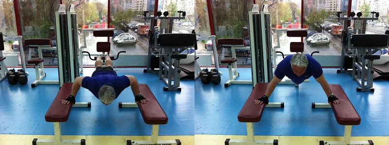bancute si sa am pozitionarea picioarelor la aceeasi inaltime, folosind scaunul aparatului de ramat. La inceput cu mai mare dificultate, mai apoi mai lejer, am inceput cu 10 flotari pe set si in cateva zile am ajuns la 30 flotari pe set. De fiecare data in ultimele zile am executat 100 flotari, in cel mult 4 seturi. Ceea ce trebuie retinut din toata aceasta abordare este legat de faptul ca la fiecare antrenament, incep cu flotari, cautand sa fac cel putin 100 si sa micsorez durata pauzei intre seturi. Lucrurile nu sunt simple daca am in vedere varsta si mai ales greutatea mea corporala, parametru asupra caruia va trebui sa insist in perioadele viitoare.