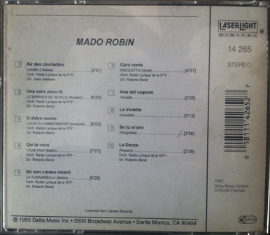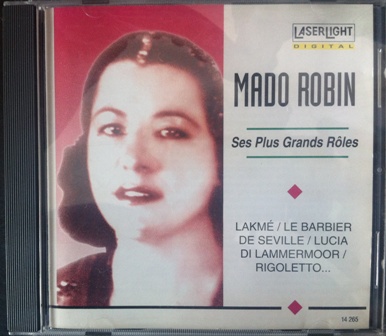 | In vremurile de demult, pe cand postul national de radio se ocupa de adevarata cultura, am avut ocazia sa ascult mari voci interpretand arii din opere celebre. La un moment dat, cand am auzit-o pe Mado Robin interpretand Aria clopoteilor din opera Lakmé de Delibes, dintr-o data m-a dus gandul spre ceva deosebit, unic, intrucat pentru prima data auzeam acea extrem de dificila arie, cantata cu dezinvoltura, lejeritate si forta. M-am minunat si mi-a ramas intiparite in minte pentru totdeauna, atat numele, cat si inalta performanta. Cu trecerea anilor, am vazut ca lumea considera ca fiind reusite alte interpretari, desi ceea ce a creeat Mado Robin este de departe cea mai buna interpretare care a existat de pana acum. Cand prin anii '90 un profesor din Franta care venise aici ca intr-o tara din lumea a treia, a vazut ca discutiile mele despre Mado Robin schimba putin lucrurile. La urmatoarea lui vizita am avut surpriza sa-mi ofere acel CD pe care nici postul national de radio nu-l avea si ceea ce era si mai trist, nici de Mado Robin nu se prea stia pe acolo. Este bine ca lumea sa intre pe youtube si sa vada ca intr-adevar Mado Robin este unica, dar si cea mai buna soprana de coloratura, pe langa care multe celebritati par numai niste voci lesinate. La noi, marea soprana Silvia Voinea a performat stralucitor in Lakmé.