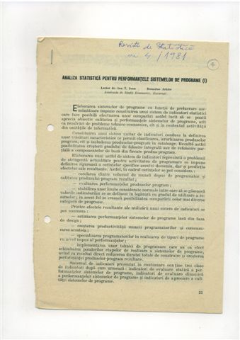 | > | | Ion Ivan, Romulus Arhire, Analiză statistică pentru performanţele sistemelor de progame (I), Revista Română de Statistică, nr. 4, 1981, pg. 21-28.