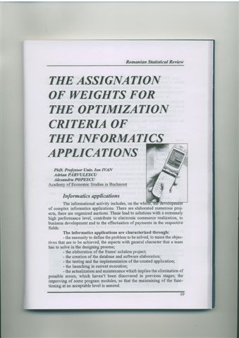| > | Ion IVAN, Adrian PIRVULESCU - The Assignation of Weights for the Optimization Criteria of the Informatics Applications, Romanian Statistical Review,no 1, 2005, pp69 - 78