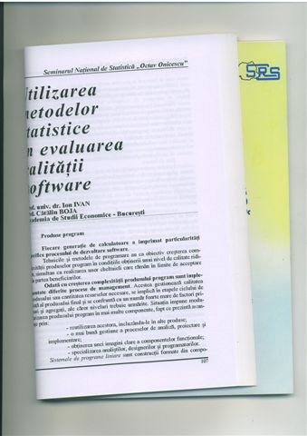 | > | Ion IVAN, Catalin BOJA - Utilizarea metodelor statistice in evaluarea calitatii software, Seminarul National De Statistica OCTAV ONICESCU, pg. 107 - 137, volum publicat de INSTITUTUL NATIONAL DE STATISTICA si SOCIETATEA ROMANA DE STATISTICA, supliment al Rvistei Romane de Statistica, pentru anul 20042005