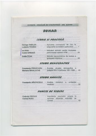| Ion IVAN, Andrei GIREADĂ, Indicatori statistici pentru evaluarea peformanţei reţelelor ATM, în “Revista română de statistică, vol. XLVIII, nr. 6, 1999, pg. 20 – 32