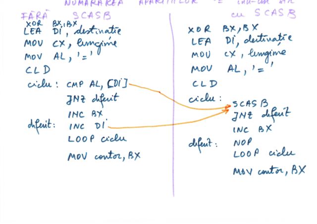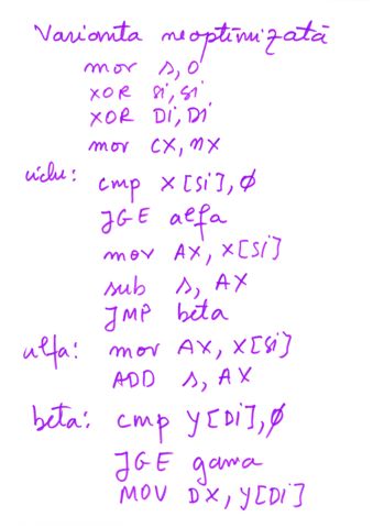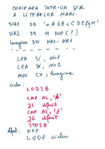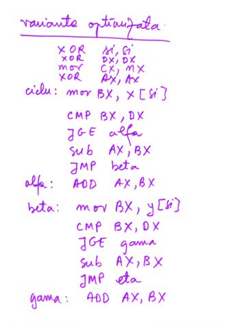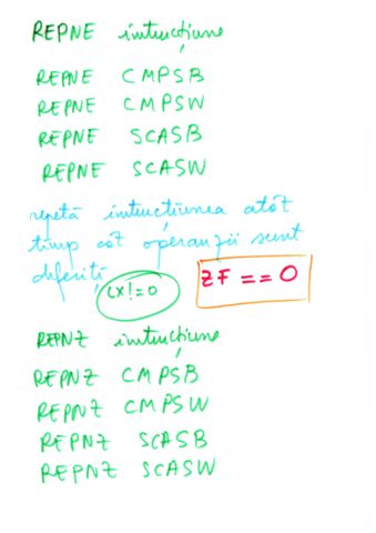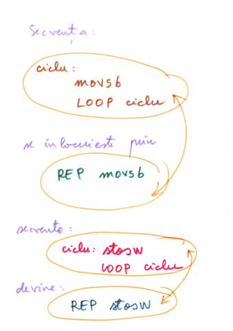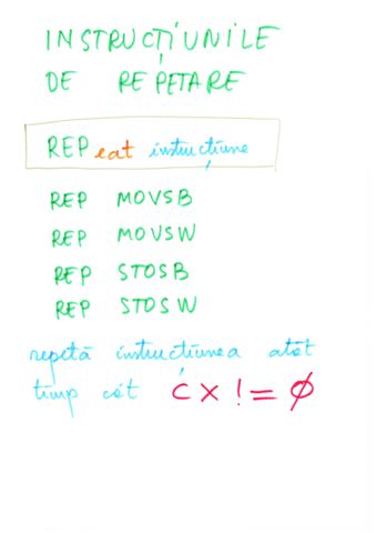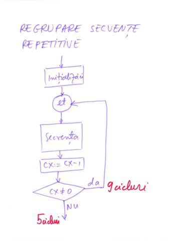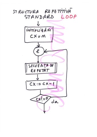 | Instructiune repetitiva conditionata posterior | relizata cu o instructiune etichetata, o secventa de repetat, o instructiune CMP si un salt conditionat inapoi spre instructiunea etichetata | do {...}while() |